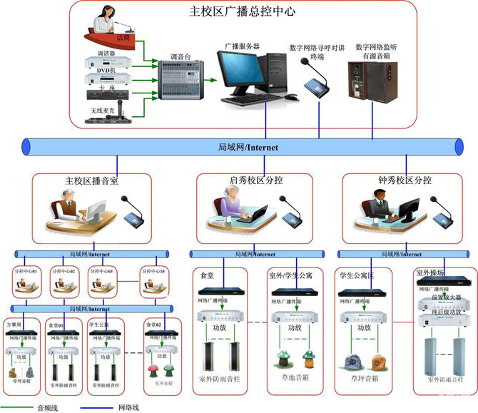 大學(xué)校園面積較大,一般都為數(shù)千畝,由多個(gè)校區(qū)和分校組成。校園內(nèi)有不同的功能分區(qū)。對(duì)校園廣播的功能要求,基本用于校園廣播站的自辦節(jié)目、校園文化的宣傳及英語四六級(jí)聽力考試等,一般無音樂鈴、廣播操等要求,但因功能分區(qū)較多、面積較大,所以要求不同分區(qū)同時(shí)播放不同的校園廣播節(jié)目,各校區(qū)及分校既可獨(dú)立運(yùn)行,廣播主控中心又可集中管理。